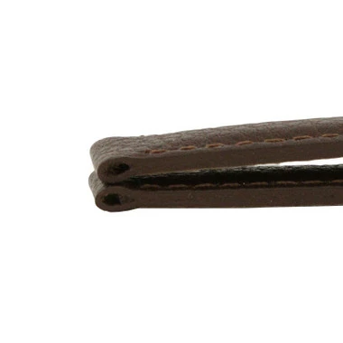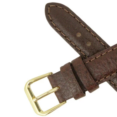 This brown leather watch band is a good choice for a standard dress watch. The leather is high polish finish and has a mild stamped texture. The watch band has light padding with matching stitching. The band features a gold tone stainless steel buckle that makes the band size adjust easily at any time. The leather is soft and flexible, requiring very little or no break-in period.