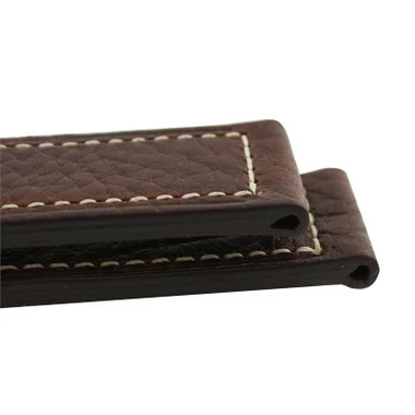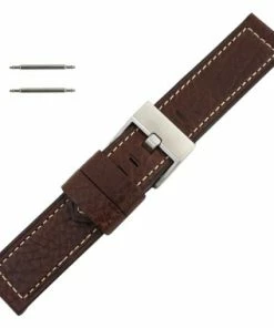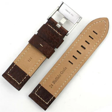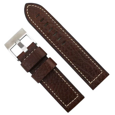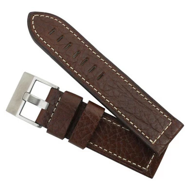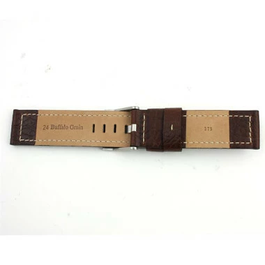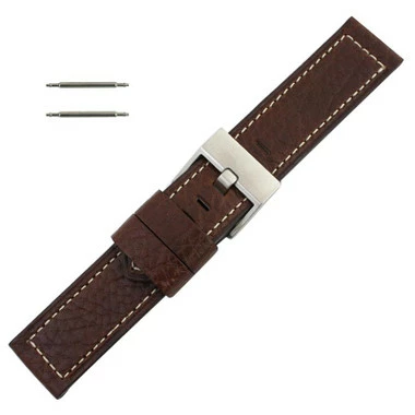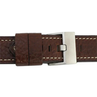 This brown leather watch band is a good choice for a heavy duty large fashion watch. The leather features vivid contrasting white stitching and has a matte finish with a mild stamped texture. The watch band is thicker then most, made with durability in mind. The band features a large and heavy silver tone stainless steel buckle that makes the band size adjust easily at any time. The heavy duty construction makes this leather watch band last longer and ideal for heavier watches.