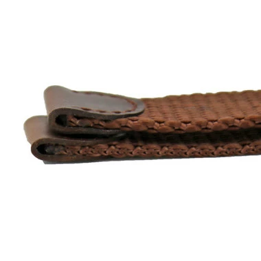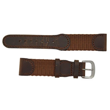 This brown leather accented Swiss Army style watch band is a good choice for a standard dress watch. The brown leather has a matte finish and is stitched, but not padded, so the watch band sits flat on your wrist. The band features a silver tone stainless steel buckle that makes the band size adjust easily at any time. The leather is soft and flexible, requiring very little or no break-in period.
