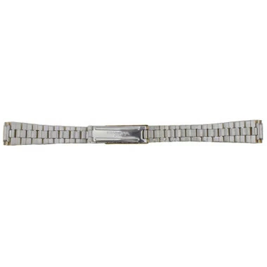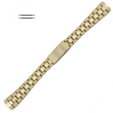 Band has adjustable squeeze style straight ends, allowing band to fit inside lugs ranging from 10-14mm. This metal band features a Tri-Fold clasp, allowing quick release and removal of the band. With the extra security catch, this type of clasp provides you with the security needed to prevent loosing your watch. The clasp is adjustable in order to change the length of your watchband. The overall length of the watchband is 6 1/2″, and has multiple t bar style links that can be removed allowing adjustment to the length of the band.