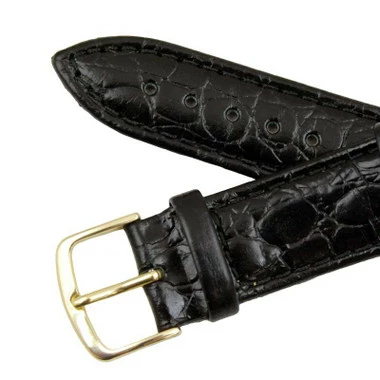 Styled for fashion watches, the black croco grain band is made of calfskin leather. The watchband is a good choice for a standard dress watch. The leather is high gloss finish to match your old watchband or apparel. The watch band is lightly padded for comfort. The band features a yellow tone stainless steel buckle that makes the band size adjust easily at any time. The leather is soft and flexible, requiring very little or no break-in period.