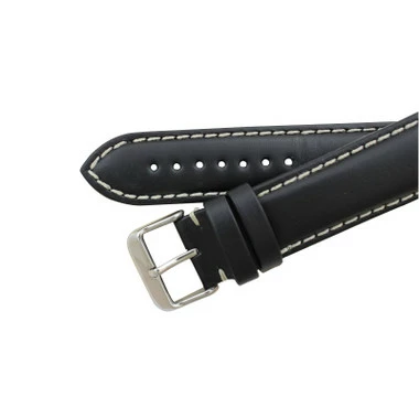 This black genuine oil tan leather watch band is a great replacement strap for a wrist watch. The remborde construction of the strap seals the edge of the band to improve its water resistance and allow for longer wear. Flexible leather requires a very short break in period. Watch band has a matte finish with contrast stitching. Heavy padding provides superior comfort while wearing. The band features a silver tone stainless steel buckle, that is easy to adjust to change the bands length.