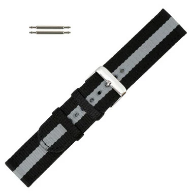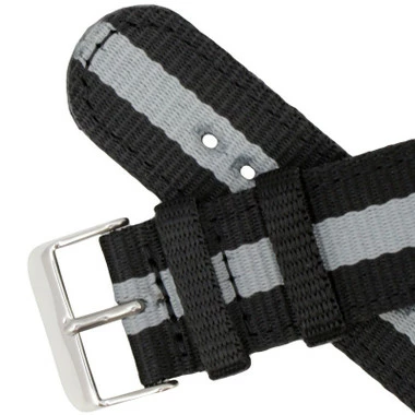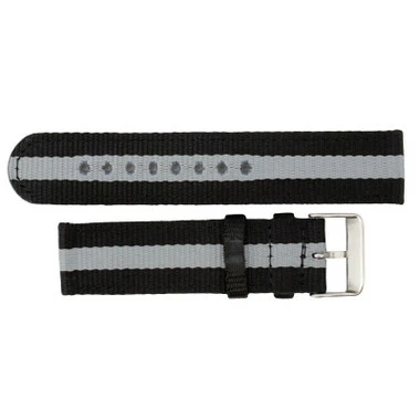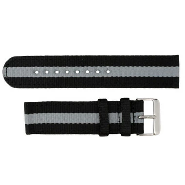 This grey and black striped nylon watch band is a good choice for . The watch band sits flat on your wrist. The band features a silver tone stainless steel buckle that makes the band size adjust easily at any time. The nylon is soft and flexible, requiring very little or no break-in period.