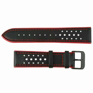 This black waterproof leather watch band is a good choice for a fashion watch. The leather features vivid contrasting red stitching and has a matte finish. The watch band has medium padding for comfort. The band features an ion-plated black tone buckle that makes the band size adjust easily at any time. The heavy construction makes this leather watch band last longer.