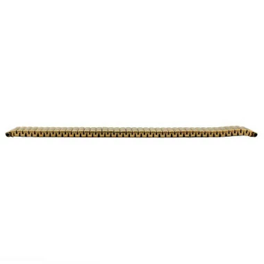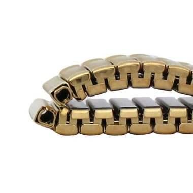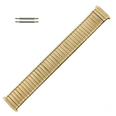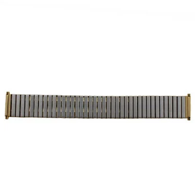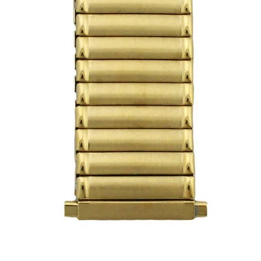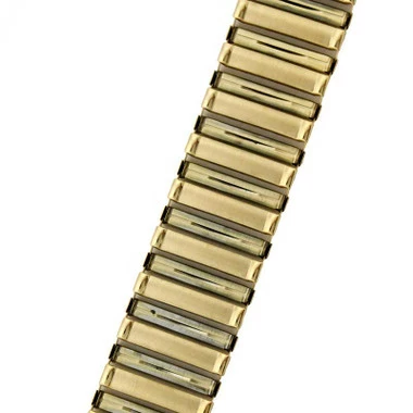 This expansion style yellow gold tone stainless steel watchband is a good choice for those seeking a good fitting comfortable stretch watch strap. The stylish links inner portion have a slight satin finish and the narrow outer portion have a highly polished finish. The expandable straight ends on this watchband cover the watch pin so the watch looks complete, allowing the band to fit onto many size watches from 20 mm to 24 mm. The watch band is adjustable, flexible and tough. Because of the design of expandable watch bands, this watch band will hold securely in place on your wrist and slip over your hand easily, so no watch buckle is needed.