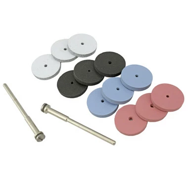 These premium silicon carbide wheels are specially formulated to provide a brilliant finish on all precious metals. Our convenient assortment covers the entire finishing process from pre-polish to final polish. Set contains two mandrels and 3 each of the following wheels: coarse (white, 100gr), medium (black, 220gr), fine (blue, 800gr) and extra fine (pink, 1200gr).
