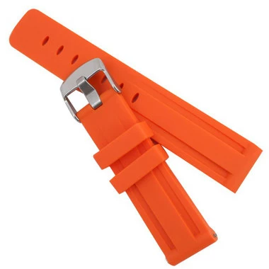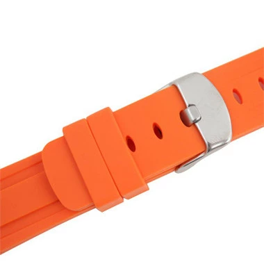 This orange Silicone watch band is a good choice for a standard to heavy use watch. The ultra soft Silicone band is extremely flexible with elastic like properties and can easily be adjusted and still fit flat and comfortably on your wrist. The durable Silicone will not deteriorate and it gives the band a tougher and longer life. It has a matte finish similar to the “jelly” watch straps. The band features a heavy duty silver tone stainless steel buckle that makes the band size adjust easily at any time. The Silicone is flexible and resilient requiring very little or no break-in period.