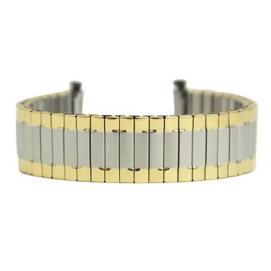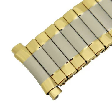 This expansion style two tone watchband is a good choice for those seeking a good fitting comfortable stretch watch strap with uniform stylish fancy links. The curved expandable ends on this watchband cover the watch pin so the watch looks complete and the design fits, allowing the band to fit onto watches from 18mm to 22mm. The watch band is adjustable, flexible and tough. It is also well suited for an office worker, in addition to physical exercise or outdoor working environments. Due to the design of expandable watch bands, it will hold securely in place on your wrist and slip over your hand easily, so no watch buckle is needed. It has quality construction with re-enforced link pins, and durable stainless steel to last years.