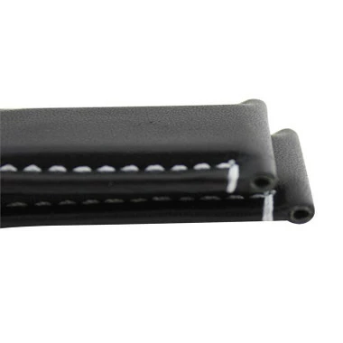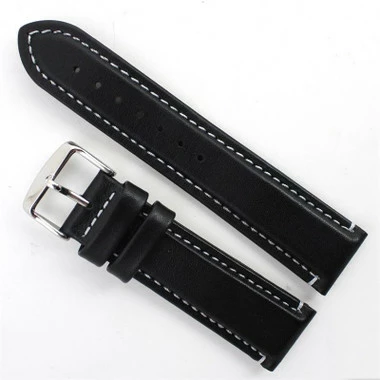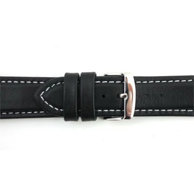 This black waterproof leather watch band is a good choice for a fashion watch. The leather features vivid contrasting white stitching and has a matte finish. The watch band has heavy padding for comfort. The band features a silver tone stainless steel buckle that makes the band size adjust easily at any time. The heavy construction makes this leather watch band last longer.